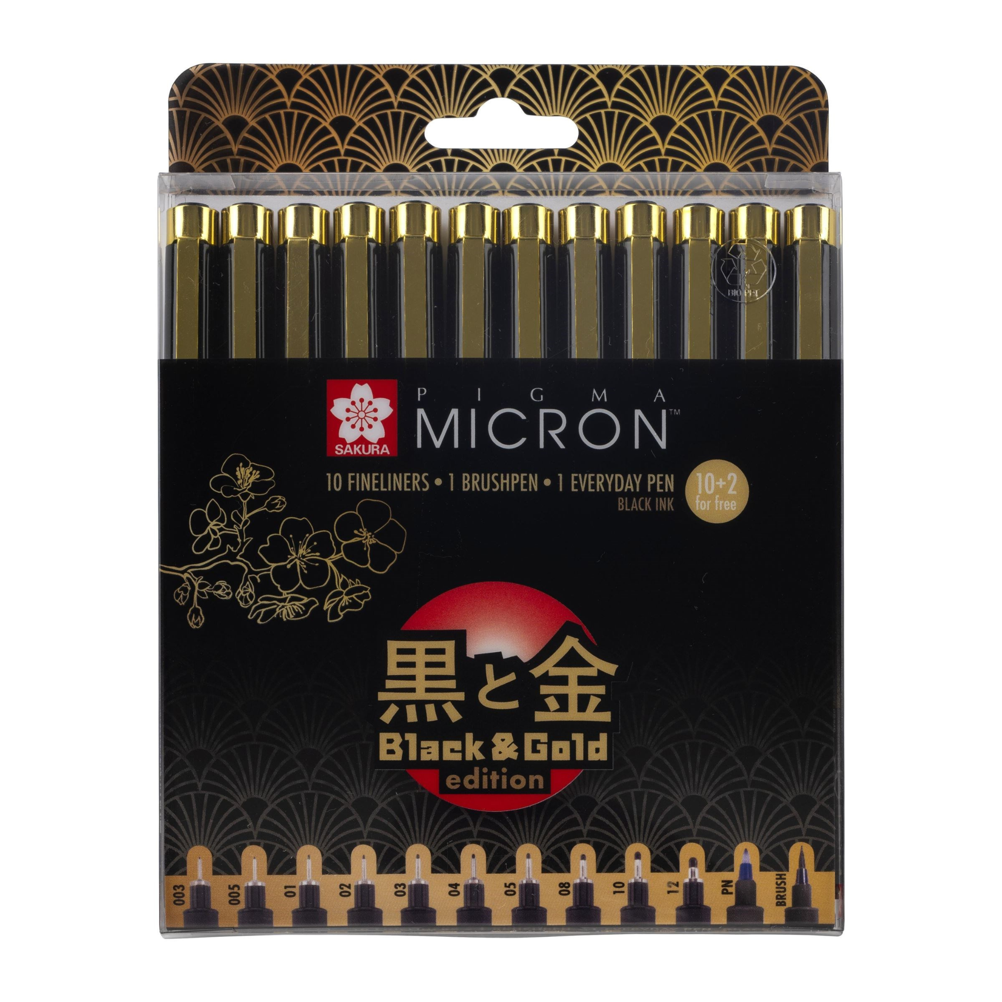 This set contains the complete Black&Gold Edition Pigma collection. Now and limited available in a special promotion package: 10 + 2 pens for free!